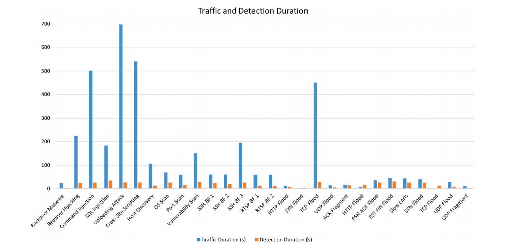 实时性验证:在模拟包含约 80 个端点的物联网网络环境中,针对多数攻击类型,IoT - PRIDS 的检测时间远短于流量持续时间。以 Web 攻击中的 Command Injection 为例,其流量持续时间为 502 秒,而 IoT - PRIDS 的检测时间仅为 26 秒;DDoS 攻击里的 UDP Fragment,流量持续 10 秒,检测时间仅需 2 秒,充分表明 IoT - PRIDS 能够满足近实时检测的实际需求,如下图所示。