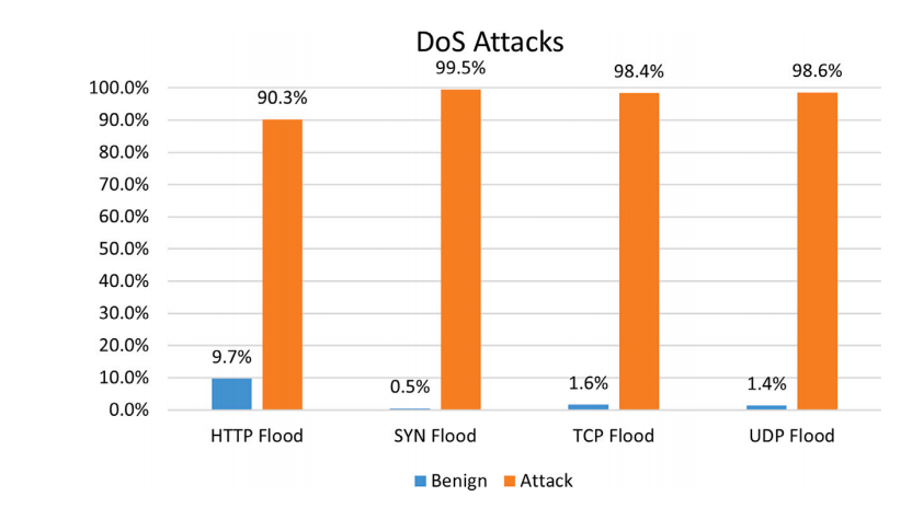 DoS 攻击检测:在 SYN Flood、TCP Flood 等 DoS 攻击类型检测中,流级检测的准确率、精确率、召回率近乎 100%。对于 HTTP Flood 攻击,由于其流量特征较为复杂,当基于 CICIoT2022 基线进行检测时,召回率为 82.47%,但在流级检测策略下,性能得到显著优化 。例如 SYN Flood 攻击,流级检测精确率、召回率、准确率均为 100%;HTTP Flood 攻击基于 CICIoT2023 基线流级检测,精确率 0.99,召回率 95%,F1 分数 0.97如下图所示。