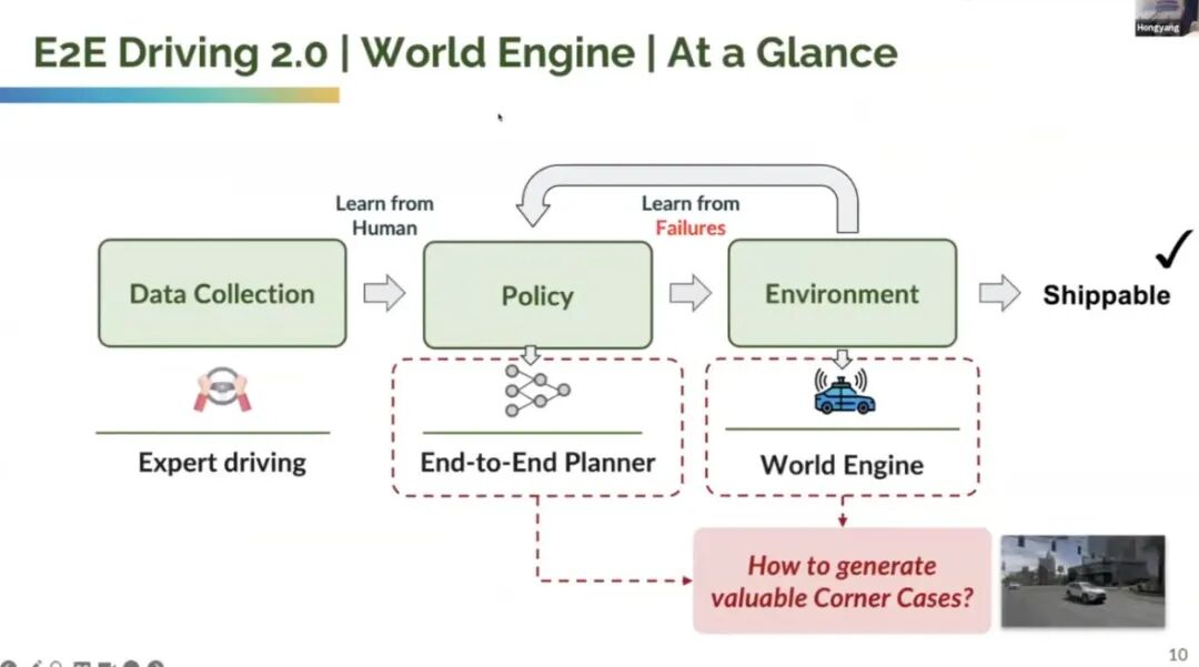 Li Hongyang 提出的 “世界引擎”,本质是一套 “主动生成高价值数据、优化端到端模型” 的全链路系统,核心由 “数据引擎(Data Engine)” 与 “算法引擎(Algorithm Engine)” 两部分构成,共同解决 “长尾场景数据稀缺” 与 “模型迭代效率低” 的问题: