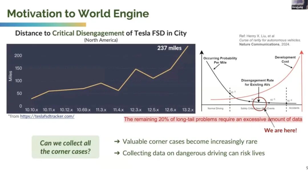 - 红色曲线(部署成本):要收集这些 “十年一遇” 的安全关键场景,需要投入庞大的车队规模(特斯拉北美车队超 200 万辆),且每增加 1% 的场景覆盖率,成本会呈指数级上升 —— 更严峻的是,“收集危险场景” 本身可能伴随安全风险(如为了采集 “前车急刹” 数据,需让测试车接近危险状态)。