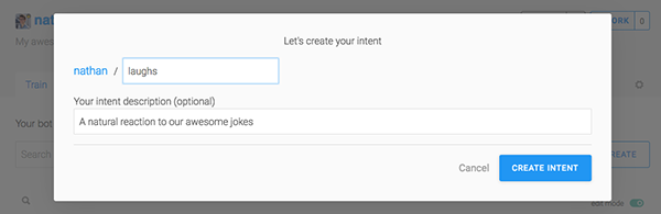 如果您想要自定义一个新的意图,那么就需要从头开始构建它。在此,我们希望Bot能够理解到对方在听到笑话时笑了。因此,您可以单击搜索字段右侧的“+ Create”,然后为您的意图起一个名称。