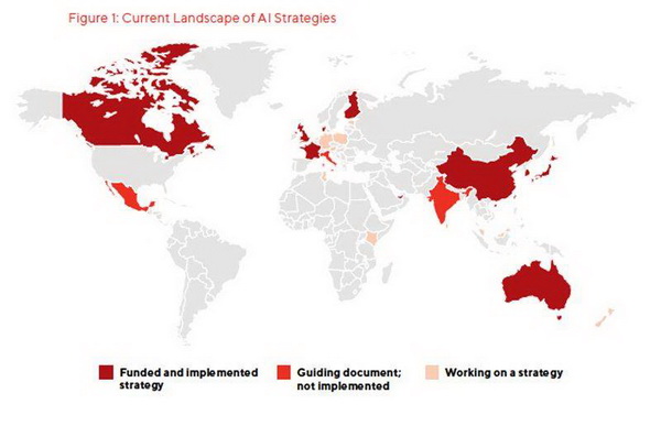 截至 2018 年 12 月,全球提出 AI 计划的国家。(图片来源:CIFAR)