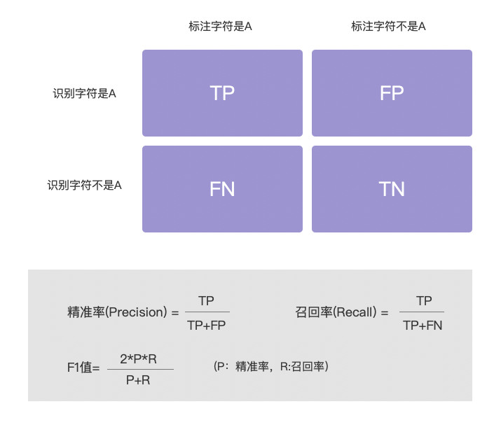 OCR模型的测试方法为比较图片中识别字符与标注的字符是否一致。例如:识别100个字符,标注是“A”识别为“A”的情况有30次,标注是“A”没有识别为“A”的情况为5次,标注不是“A”被识别为“A”的次数有8次。综上所述:TP为30次,FN为5次,FP为8次。
