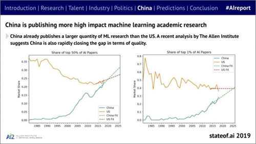 艾伦AI研究所通过分析所有论文中引用次数前50%的论文中美各自的占比,可以看出到2020年,这一部分论文中美所占比例将持平,各自占到四分之一左右;而后,便是中国大幅度领先。分析全球引用次数前1%的AI论文,也就是真正具有最高影响力、最高学术价值的那一部分。美国几乎是停滞不前的,中国则高速前进。根据图中预测,按照如今速度发展,2025年,在TOP 1%的AI论文中,中国占比也将超越美国,双方各占半壁江山,而其后,中国产出的更多AI论文势必将中国推上AI第一大国的宝座。
