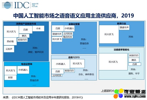 语音语义领域,算法的创新仍在继续,2019年走向市场的新算法模型包括Bert,Xlnet,ERINE。从应用场景看,占据市场规模最大的应用场景包括消费级市场的语音助理,企业级市场对话式人工智能客服,以及教育行业的口语测评和法庭庭审智能化。下图展示了IDC追踪的在各应用场景下的主流厂商,其中面积大小代表了厂商的相对份额。