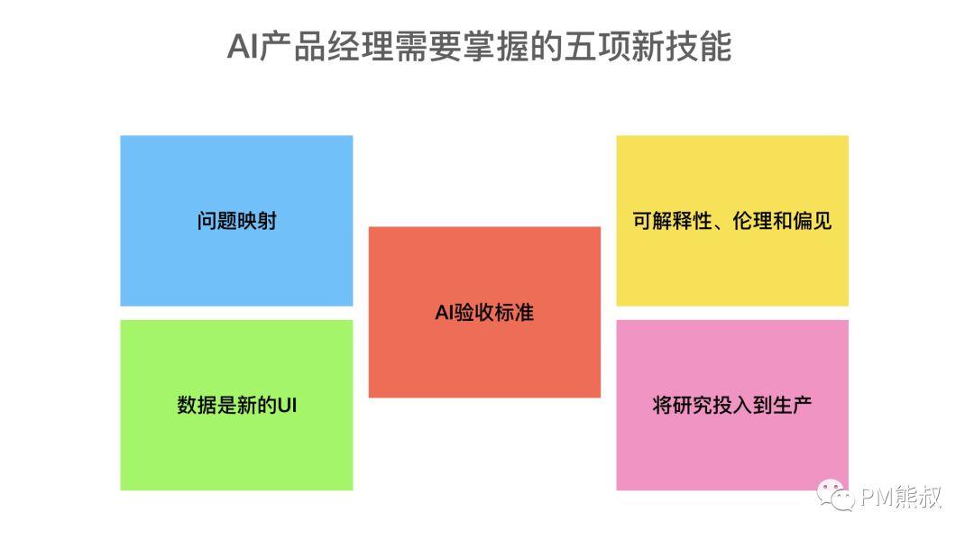 同时,产品经理还需要更新技能树的五个方面:1. 问题映射,2. 数据素养,3. 验收标准,4.可解释性、伦理和偏移,5.将研究迁移到生产。