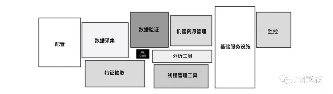 真实世界的机器学习系统只有一小段机器学习代码,如中间的小黑盒所示。但其所需的周边基础设施庞大而复杂。这与大家普遍认知相反,您可能会认为机器学习是你的人工智能产品的最大和最主要组件,但在现实世界中它只是一小块。