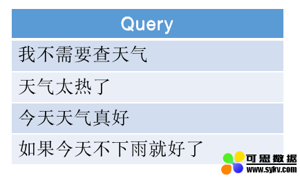 反例数据指的是非该意图的数据,就是除了正例数据,理论上所有的数据都是反例数据。像“明天要是不下雨就好了”、“我知道现在在下雨”、“我不想查天气预报”等,这些都不是我们定义的“查天气”的意图。