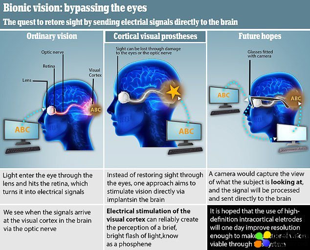 正常的视觉由眼睛观察和视觉神经传递信号到视觉皮层产生(左)。植入电极产生视觉绕过了通过眼睛或视神经进行视觉处理的前一阶段(中)。未来可以用无线传输方式将视觉信号传递给视觉皮层(右)。