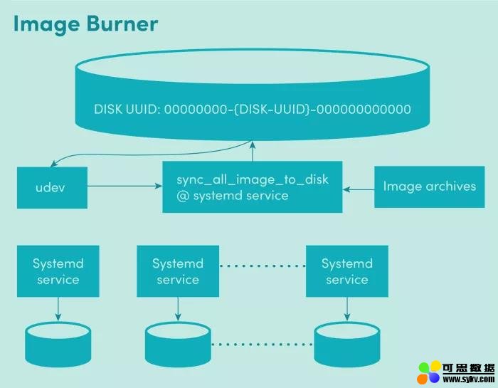 映像刻录机组件负责将可启动文件系统构建到多个硬盘驱动器上。该组件需要处理 20 多个硬盘驱动器,这些硬盘驱动器在系统打开时由操作员插入和拔出。
