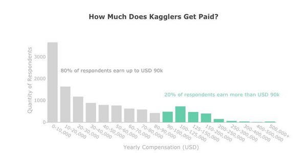 显然,经验越丰富,赚得就越多。所以看开点,你不太可能凭借两年经验就成为收入前 20% 的 Kaggler 之一。