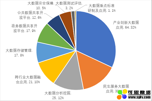 2018年10月,工业和信息化部办公厅公布了2018年大数据产业发展试点示范项目200项,其中项目数量最多的产业创新大数据应用,达到64项,其次时民生服务大数据应用,达到30项,其他分别为大数据分析挖掘25项,跨行业大数据融合应用21项,大数据存储管理17项,政务数据共享开放平台17项,公共数据共享开放平台12项,大数据安全保障10项,大数据测试评估3项,大数据重点标准研制及应用1项。