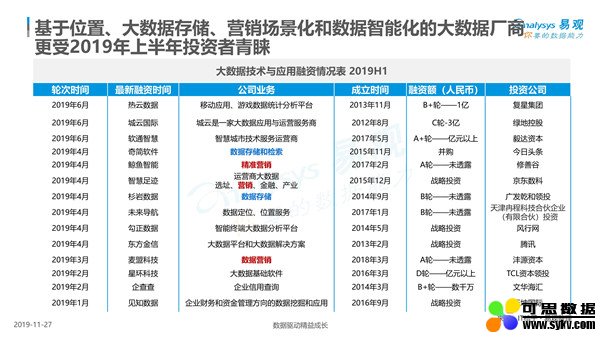 基于位置、大数据存储、营销场景化和数据智能化的大数据厂商 更受2019年上半年投资者青睐。