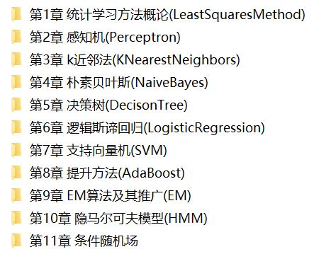 《统计学习方法》官方没有提供代码实现,但是网上有许多机器学习爱好者尝试对每一章的内容进行了代码实现。作者在 GitHub 网站搜集了一些代码进行整理,并作了一定的修改,使用 Python3.6 实现了第 1-11 章的课程代码。
