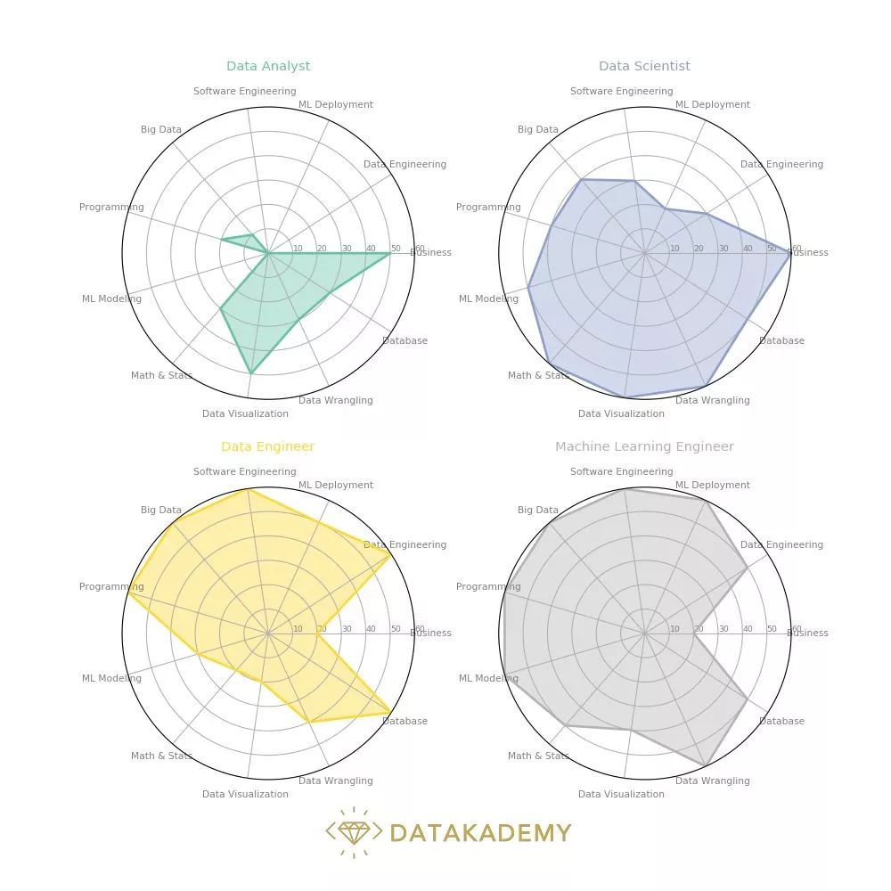 我们现在清楚地了解数据科学中的主要角色,但每位理想候选人的技能集是什么样的?为了以直观的方式进行说明,我使用 Matplotlib 创建了蜘蛛图将这些画像可视化。由于这很大程度上是我的直观看法,我们将在未来的迭代中抓取并分析来自 Indeed 的职位发布数据,以验证画像。