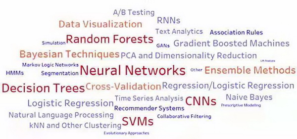 在数据科学领域实际工作项目中,随着AI和机器学习的不断渗透,神经网络模型、CNN卷积神经网络、随机森林、决策树和SVM支持向量机模型的使用逐渐趋于频繁。另外,功能强大的集成方法、贝叶斯及数据可视化也十分受欢迎,时间序列和文本挖掘如NLP也逐渐被使用,回归仍是工作之中最经典的算法之一。