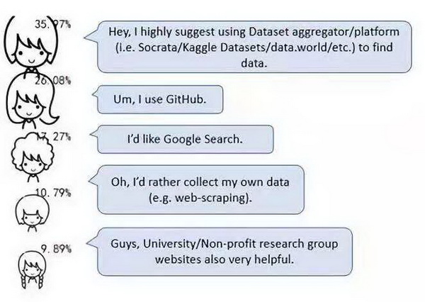 没有数据一切就是无稽之谈,之前也提到在前期数据的准备阶段最为耗时,如何找到有效且干净的数据用于训练和项目开发就显得相当重要。其中36%推荐使用数据集聚合平台,如本文的数据来源Kaggle等社区便成为最频繁使用的平台。世界上最大的代码库GitHub也有数据的大量资源共享,另外自己通过爬虫也是很好的获取数据资源方法。
