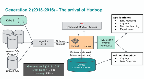 到2017年初,我们的大数据平台被整个公司的工程和运营团队使用,使他们能够在一个地方访问新的和历史的数据。用户可以通过单一的 UI 接口轻松访问 Hive,Presto,Spark,Vertica,Notebook 中的数据。我们的计算集群中有超过 100PB 的数据,集群共有 100,000 vcores。每天有超过 100,000 个 Presto 查询、 10,000个Spark 作业、20,000个 Hive 查询。我们的 Hadoop 分析平台遇到了可扩展性问题,许多服务都受到高数据延迟的影响。