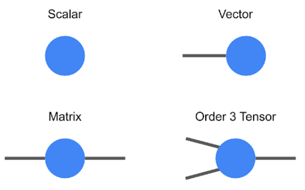 不过涉及到高阶时,这种符号法就变得非常麻烦。使用图解符号对于解决这个问题很有用,一种方法是简单地绘制一个圆(或其他形状),引出多条线或者说“腿”,腿的数量与张量的阶数相同。在这种表示法中,标量表示为一个圆,矢量有一条腿,矩阵有两条腿等。张量的每条腿也有一个尺寸,就是腿的长短。例如,表示物体通过空间的速度的矢量就是三维的一阶张量。