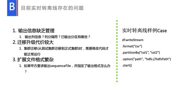 另外一个就是迁移升级问题。在百度内部存在集群迁移的问题,一个机房一般用几年之后,都会下线,这时候就会存在机型迁移。在输出路径上,或者在输出格式上,需要做出改变。而现在,一般来说,就是很多数据开发的人员,更期望的是开发的代码,能长时间运行。如果我用当前的实时转离线方案的话,肯定需要拿到原生的代码进行修改,再搭架构,再执行,这也是现实场景中用户吐槽最多的。