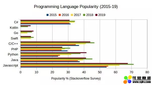 下面提供的两个表格总结了过去五年(2015-2019)里编程语言的流行趋势。该数据来自 2015-2019 年的 Stackoverflow 人气调查。
