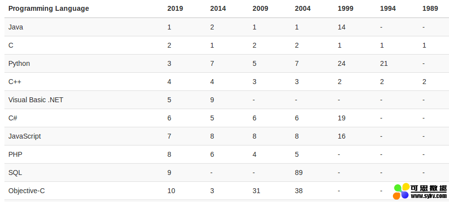 用于对编程语言进行排名的 TIOBE 指数基于搜索引擎的搜索结果。在 TIOBE 指数中, Java 在过去二十年中一直占据主导地位,C 在过去三十年里也一直保持着第一或者第二的位置。而在过去的二十年里, Python 的排名飞速增长,从 1999 年的第 24 名,到 2019 年的第 3 名。