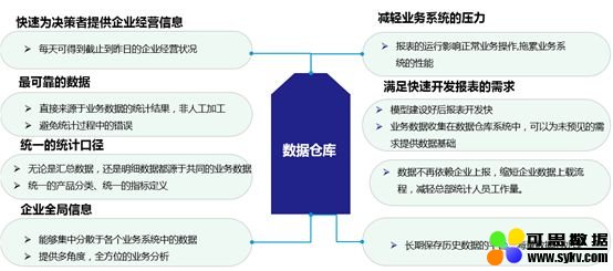 数据仓库系统的作用能实现跨业务条线、跨系统的数据整合,为管理分析和业务决策提供统一的数据支持。数据仓库能够从根本上帮助你把公司的运营数据转化成为高价值的可以获取的信息(或知识),并且在恰当的时候通过恰当的方式把恰当的信息传递给恰当的人。