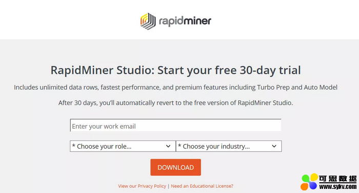 我们需要登录rapidminer的官网来下载这个数据挖掘工具,如下是该网址:https://rapidminer.com/get-started/