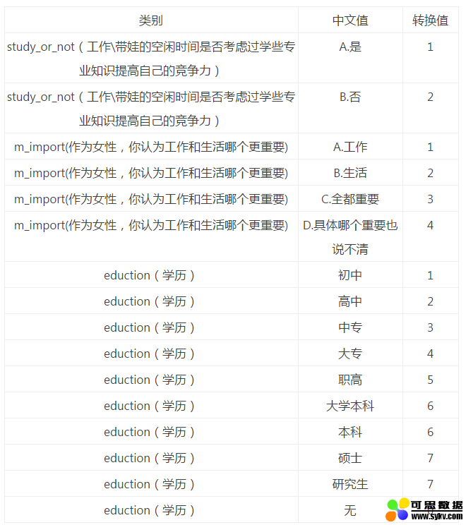 (3)“映射变换”的作用是将eduction、major、m_work及child_sex列根据字典表的映射关系,转换成数字。(Replace (Dictionary))