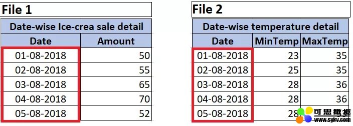 假设我们有两个含有日期列的csv文件,内容如下图所示,单击此处下载示例文件。