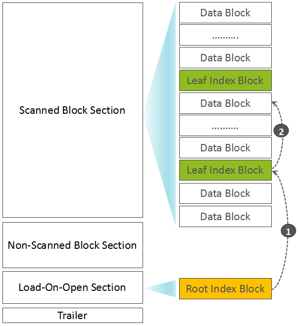 在”Scanned Block Section“区域,Data Block(存放用户数据KeyValue)、存放Data Block索引的Leaf Index Block(存放Data Block的索引)与Bloom Block(Bloom Filter数据)交叉存在。