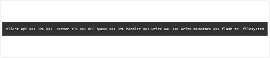 整个写入流程从客户端调用API开始,数据会通过protobuf编码成一个请求,通过scoket实现的IPC模块被送达server的RPC队列中。最后由负责处理RPC的handler取出请求完成写入操作。写入会先写WAL文件,然后再写一份到内存中,也就是memstore模块,当满足条件时,memstore才会被flush到底层文件系统,形成HFile。
