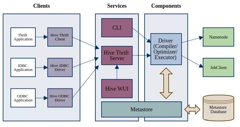 底层驱动:解释器、编译器、优化器、执行器。HiveQL查询语句从词法分析。语法分析,编译,优化以及查询计划生成。生成的查询计划存储在HDFS中,并在后面的MapReduce中进行调用执行