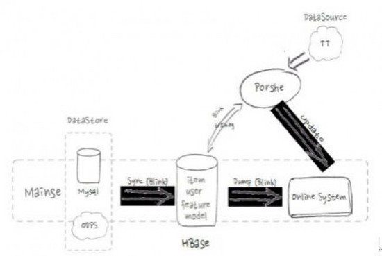 如上图,分析线上日志,归结为商品和用户两个纬度,导入分布式、持久化消息队列,存放到HBase上。随线上用户的点击行为日志来产生数据更新,对应模型随之更新,进行机器学习训练,这是一个反复迭代的过程。