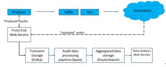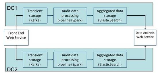 如图10所示,审计元数据通过前端服务(front end web service)到达Kafka, 我们利用Kafka来实现高可用的临时存储(transient storage), 这样,我们的数据生产者和消费者在发送审计数据的同时,就不会发生阻塞进而影响更重要的数据流。