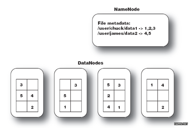 大文件被分成默认64M一块的数据块分布存储在集群机器中.如下图中的文件 data1被分成3块,这3块以冗余镜像的方式分布在不同的机器中.