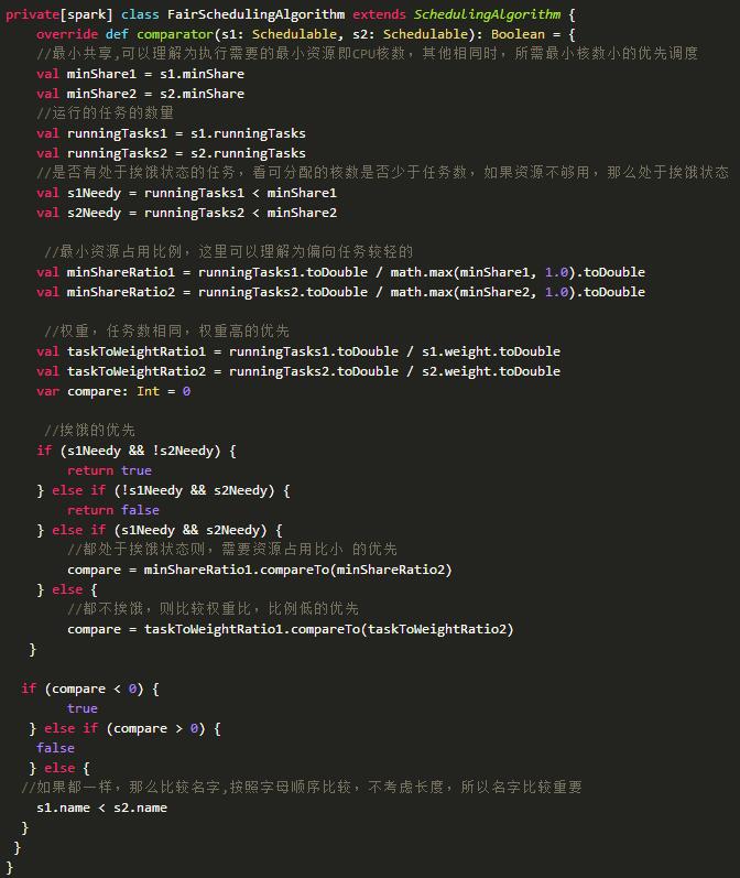 Spark目前有两种调度策略,一种是FIFO即先来先得,另一种是FAIR即公平策略。所谓的调度策略就是对待调度的对象进行排序,按照优先级来进行调度。调度的排序接口如下所示,就是对两个可调度的对象进行比较。