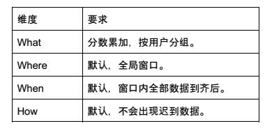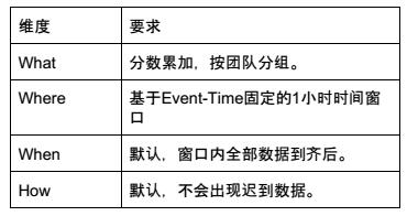 按照小时统计每个团队的分数,获得最高分数的团队可能获得奖励,这个分析任务增加了对窗口的要求,不过我们依然可以通过一个批处理任务实现,该任务的“WWWH”四维度分析如下: