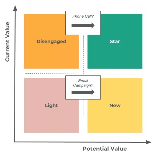 通过使用消费交易数据,我们将会通过创建一个2 x 2的有价值属性的矩阵来得到4个客户群。每一个客户群将与其他群体有两大区别,即当前客户价值和潜在客户价值。