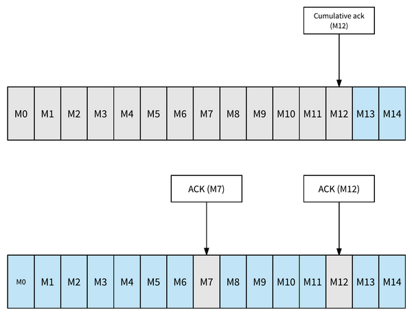 Apache Pulsar 可以支持消息的单条确认,也就是选择性确认。消费者可以单独确认一条消息。 被确认后的消息将不会被重新传递。下图说明了单条确认和累积确认的差异(灰色框中的消息被确认并且不会被重新传递)。在图的上半部分,它显示了累计确认的一个例子,M12 之前的消息被标记为 acked。在图的下半部分,它显示了单独进行 acking 的示例。仅确认消息 M7 和 M12 - 在消费者失败的情况下,除了 M7 和 M12 之外,其他所有消息将被重新传送。