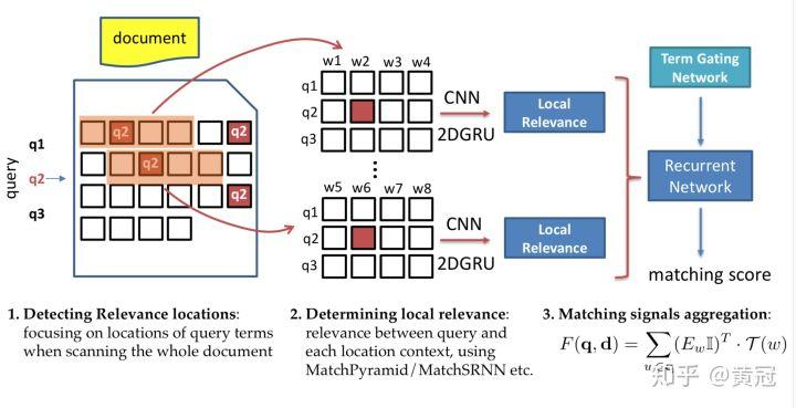 这种方法是不直接学习 query 和 doc 的语义表示向量,而是在底层,就让 query 和 doc 提前交互,建立一些基础的匹配信号,例如 term 和 term 的匹配,再想办法把这些基础的匹配信号融合成一个匹配分。