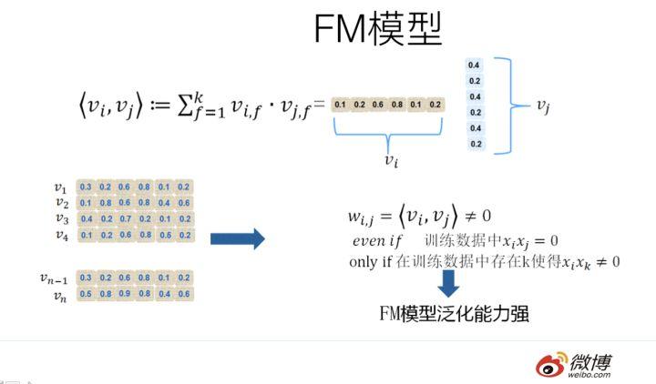 都能学会自己对应的 embedding,所以可以通过内积算出这个新特征组合的权重。这是为何说 FM 模型泛化能力强的根本原因。