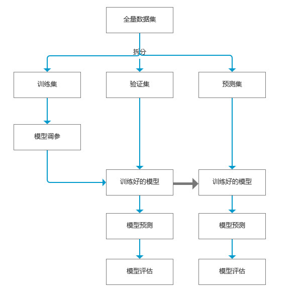 通常情况下,会将完成特征工程和标签工程的数据拆成三份:一份训练数据,一份验证数据,一份预测数据,其比例大概可以设为数据集的60%,20%和20%。训练集用于训练模型,验证集用于验证训练集训练模型效果,通过调参逐步提高验证集上模型的预测效果,预测集用于判断模型对于新数据是否有效,是否存在过拟合。