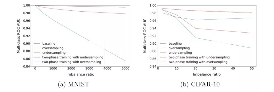 从图 3.11中可以看到:相比于简单任务(MNIST),数据不平衡对CNN在复杂任务(CIFAR-10)上的表现影响更大;随机过采样方法在几乎所有情况下都要优于其他方法。