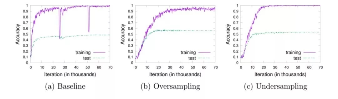 图 3.15比较了不使用任何不平衡学习算法、随机过采样和随机降采样的泛化能力。从图中可以看出,对于该任务中使用的CNN模型,随机过采样方法可以在测试集上取得最优的分类准确率,并且不会导致更严重的过拟合。