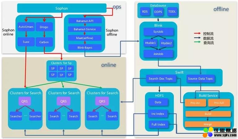 搜索引擎分为数据源聚合 (俗称 dump)、全量 / 增量 / 实时索引构建及在线服务等部分,以 Tisplus 为入口经由 Bahamut(Maat 进行工作流调度)->Blink->Hdfs/Swift->BuildService->Ha3->SP->SW 等阶段对客户提供高可用 / 高性能的搜索服务。其中数据源聚合在 tisplus 平台和 Blink 平台完成,Build service 和 Ha3 在 suez 平台完成,SP 和 SW 通过 drogo 进行部署。具体架构图如下: