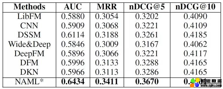 我们的实验在真实新闻推荐数据集上开展,数据集从 MSN 新闻一个月的记录中采样得到。我们使用最后一周的日志作为测试,其余用作训练和验证。结果如表 1 所示。