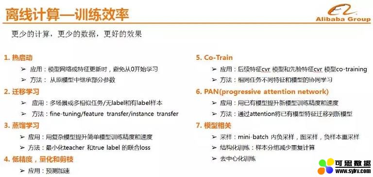 低精度、量化和剪枝:随着模型越来越复杂,在线存储和预测成本也在成倍增加,通过这些方式降低模型存储空间和预测速度,另外是端上模型通常对大小有强要求;