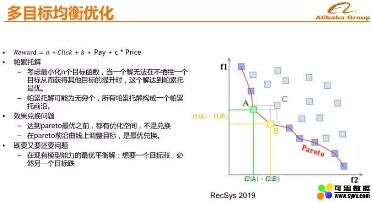 在推荐时,大家往往会遇到多目标均衡问题,比如商品推荐的浏览深度,点击和成交,由于目标量纲不一致,不存在全局唯一最优解,需要同时优化多个目标或在多个目标之间做合理取舍,对此我们提出了基于帕累托的多目标优化排序模型。更多可参考我们发表在 RecSys 2019 的文章。
