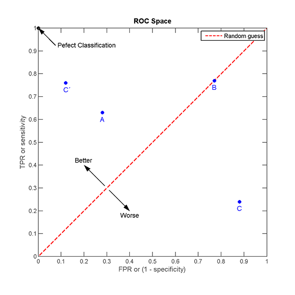 ROC是一种图形表示,显示分类模型在所有分类阈值下有怎样的表现。我们更喜欢比其他分类器更快逼近1的分类器。